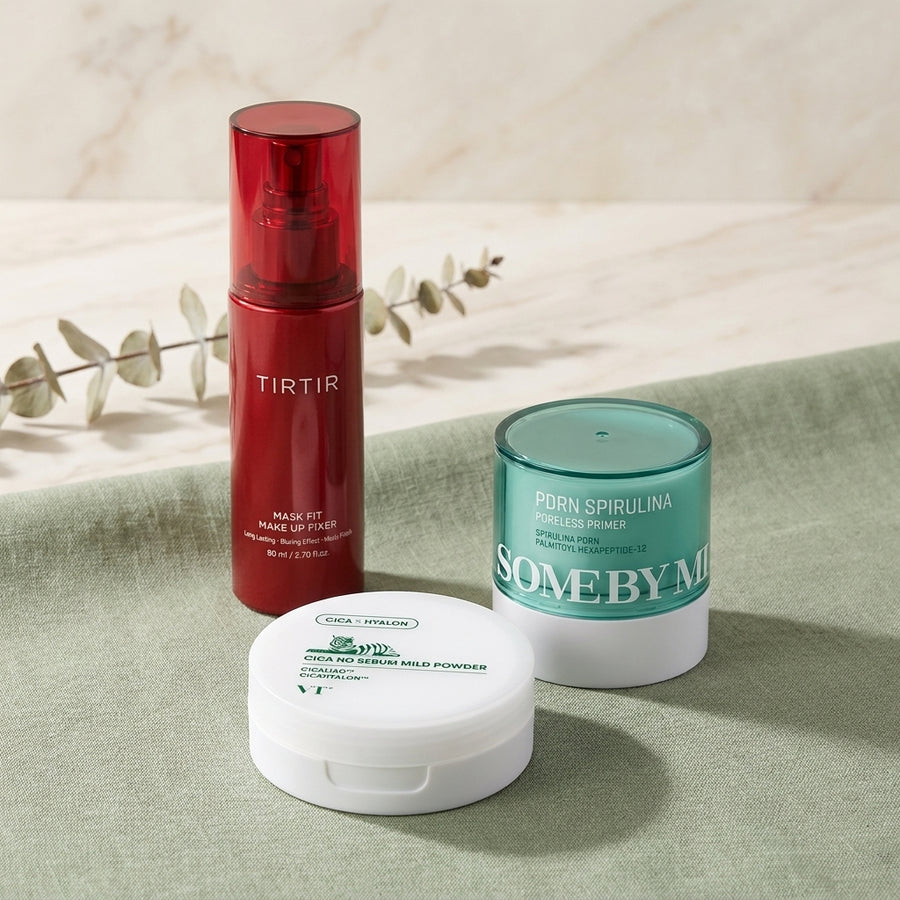 SOME BY MI PDRN Spirulina Poreless Primer - stick 10g, primer blur cu Spirulina și Aquasebum TIRTIR Mask Fit Make Up Fixer - spray 80ml cu Centella Asiatica, fixare până la 24h VT COSMETICS Cica No Sebum Mild Powder - pudră 5g cu complex CICAHYALON, anti-luciu peste zi