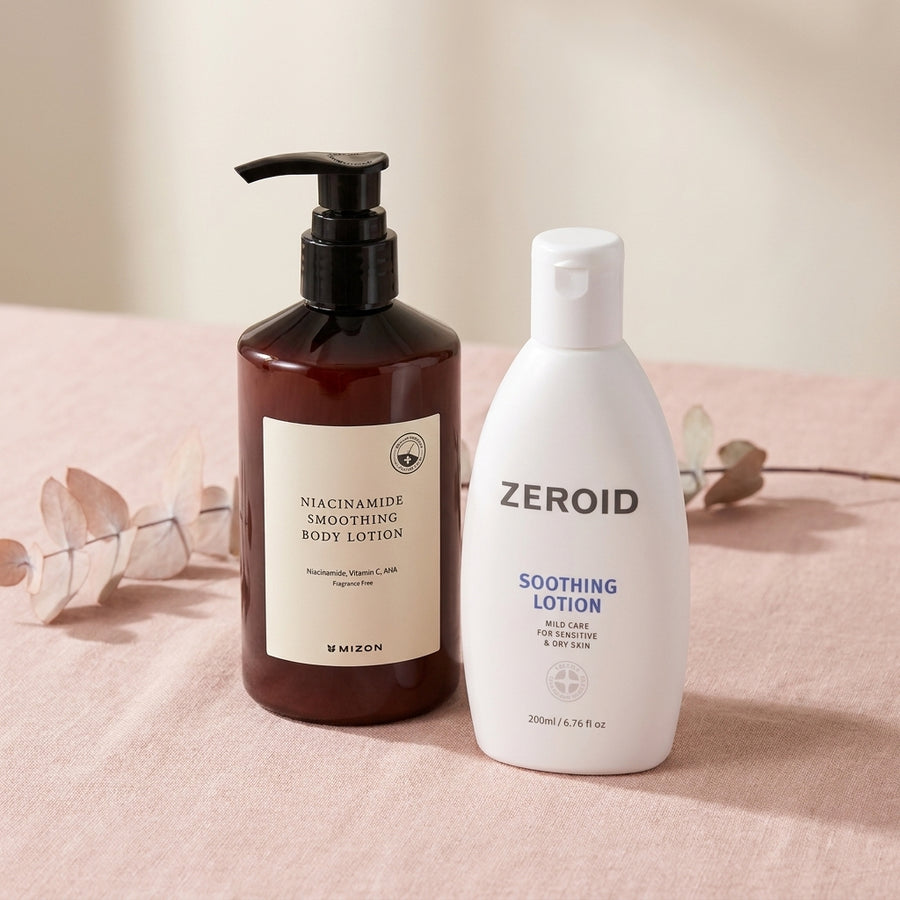 MIZON Niacinamide Smoothing Body Lotion - 300ml, loțiune cu niacinamidă 10%, acid lactic (AHA), vitamina C și acid hialuronic ZEROID Soothing Lotion - 200ml, loțiune hipoalergenică cu Ceramide-9S, tehnologie MLE® și ulei de seminte de șofrănel (pentru corp și față)